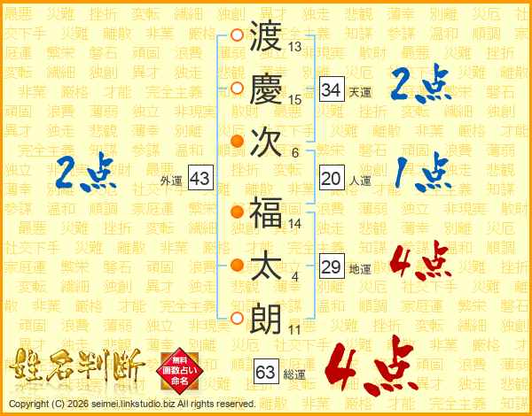 渡(13画)慶(15画)次(6画) 福(14画)太(4画)朗(11画)
