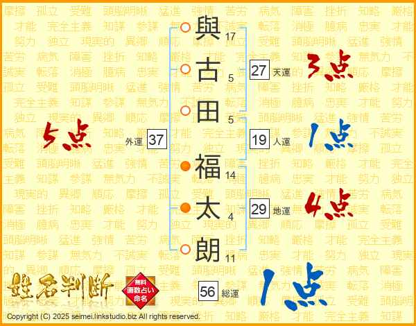 與(17画)古(5画)田(5画) 福(14画)太(4画)朗(11画)