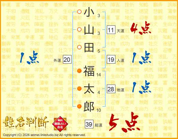 小(3画)山(3画)田(5画) 福(14画)太(4画)郎(10画)
