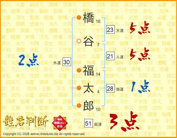 橋(16画)谷(7画) 福(14画)太(4画)郎(10画)