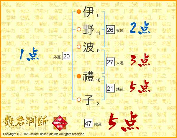 伊(6画)野(11画)波(9画) 禮(18画)子(3画)