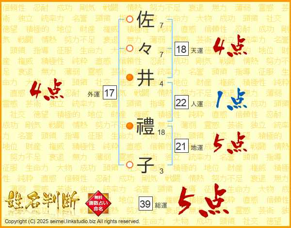 佐(7画)々(7画)井(4画) 禮(18画)子(3画)
