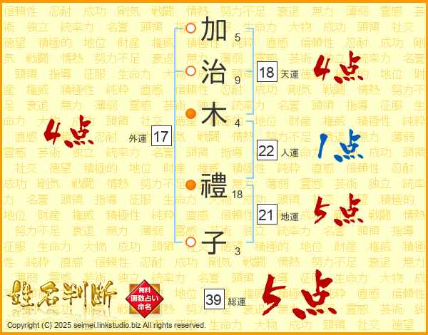 加(5画)治(9画)木(4画) 禮(18画)子(3画)