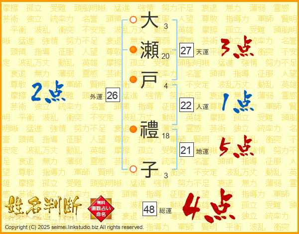 大(3画)瀬(20画)戸(4画) 禮(18画)子(3画)