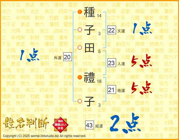 生活面を象徴する運勢です。外部から受ける影響力を表し、結婚運、家庭運や職場、環境への順応性を表します。総運から人運を引いた画数。姓や名が1文字の場合を除く。