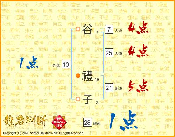 生活面を象徴する運勢です。外部から受ける影響力を表し、結婚運、家庭運や職場、環境への順応性を表します。総運から人運を引いた画数。姓や名が1文字の場合を除く。