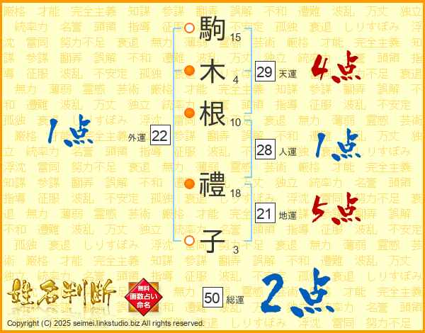 駒(15画)木(4画)根(10画) 禮(18画)子(3画)