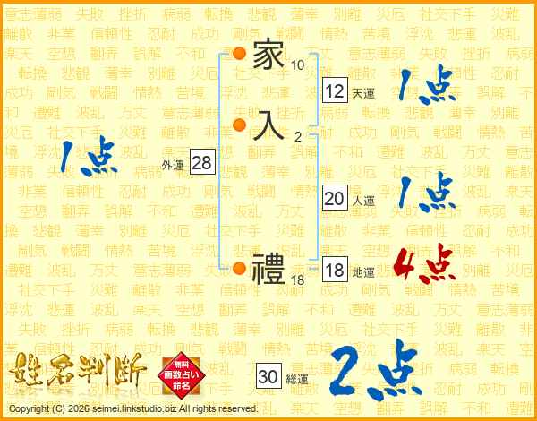生活面を象徴する運勢です。外部から受ける影響力を表し、結婚運、家庭運や職場、環境への順応性を表します。総運から人運を引いた画数。姓や名が1文字の場合を除く。