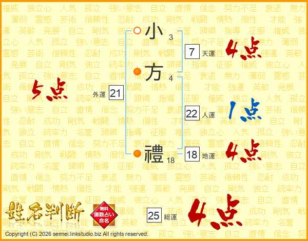小方禮さんの総運は25画の4点!