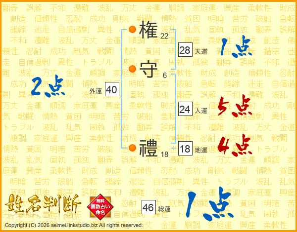 生活面を象徴する運勢です。外部から受ける影響力を表し、結婚運、家庭運や職場、環境への順応性を表します。総運から人運を引いた画数。姓や名が1文字の場合を除く。