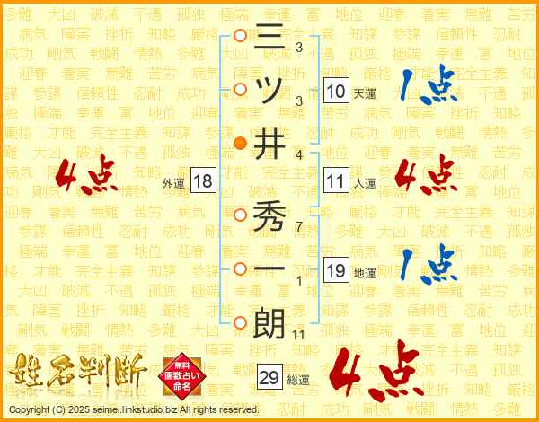 三(3画)ツ(3画)井(4画) 秀(7画)一(1画)朗(11画)