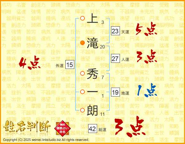 上(3画)滝(20画) 秀(7画)一(1画)朗(11画)