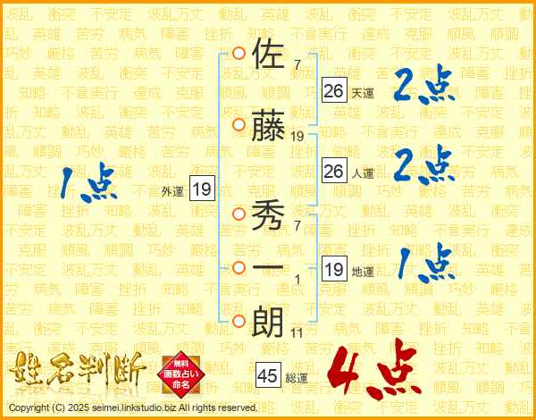 佐(7画)藤(19画) 秀(7画)一(1画)朗(11画)