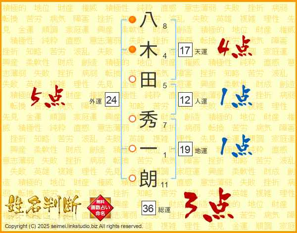 八(8画)木(4画)田(5画) 秀(7画)一(1画)朗(11画)