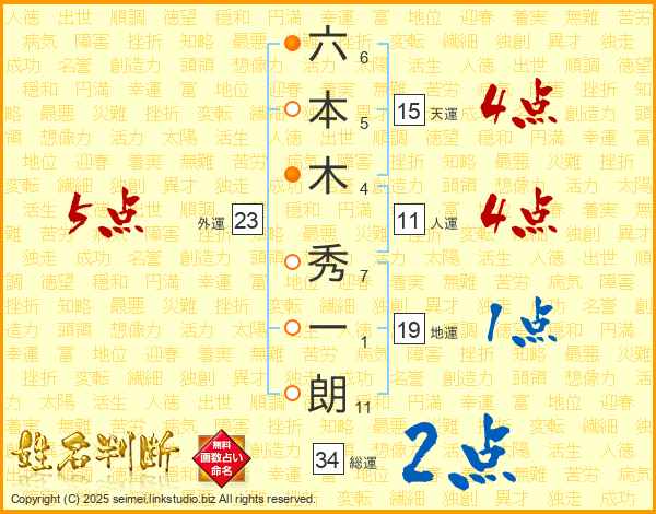 六(6画)本(5画)木(4画) 秀(7画)一(1画)朗(11画)