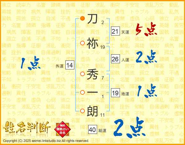 刀(2画)祢(19画) 秀(7画)一(1画)朗(11画)