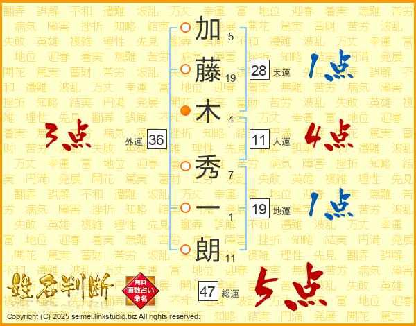 加藤木秀一朗さんの総運は47画の5点!