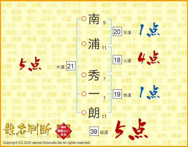 南(9画)浦(11画) 秀(7画)一(1画)朗(11画)