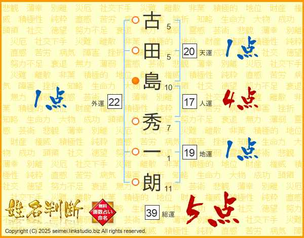 古(5画)田(5画)島(10画) 秀(7画)一(1画)朗(11画)