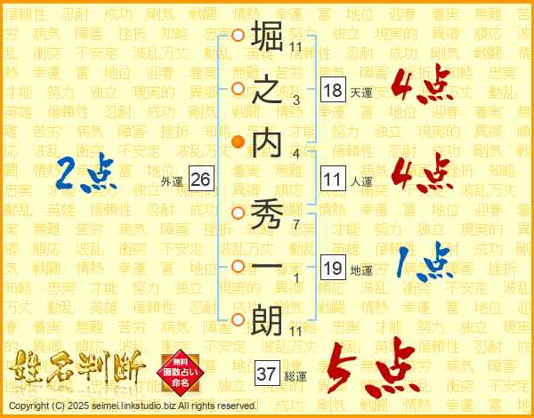 堀(11画)之(3画)内(4画) 秀(7画)一(1画)朗(11画)