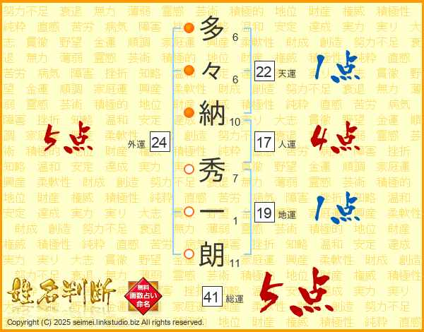 多(6画)々(6画)納(10画) 秀(7画)一(1画)朗(11画)