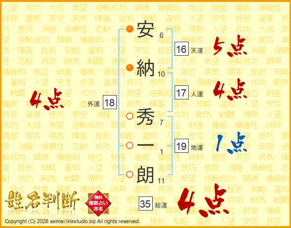 安(6画)納(10画) 秀(7画)一(1画)朗(11画)