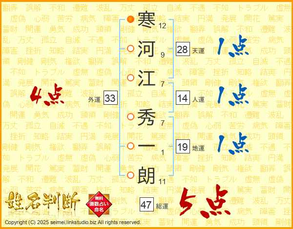 生活面を象徴する運勢です。外部から受ける影響力を表し、結婚運、家庭運や職場、環境への順応性を表します。総運から人運を引いた画数。姓や名が1文字の場合を除く。