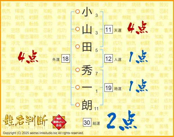 小(3画)山(3画)田(5画) 秀(7画)一(1画)朗(11画)