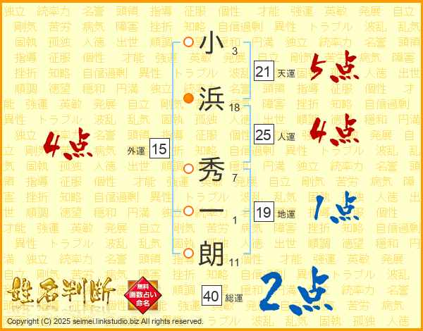 小(3画)浜(18画) 秀(7画)一(1画)朗(11画)