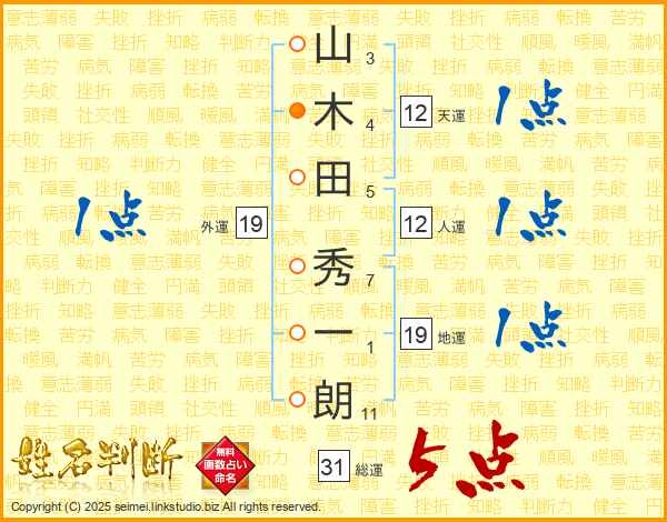 山(3画)木(4画)田(5画) 秀(7画)一(1画)朗(11画)