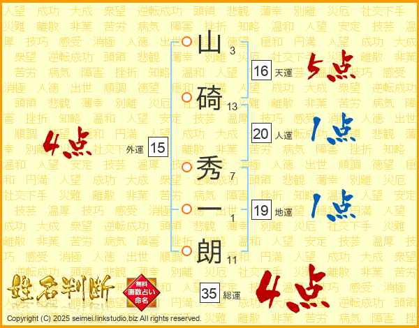 山(3画)碕(13画) 秀(7画)一(1画)朗(11画)