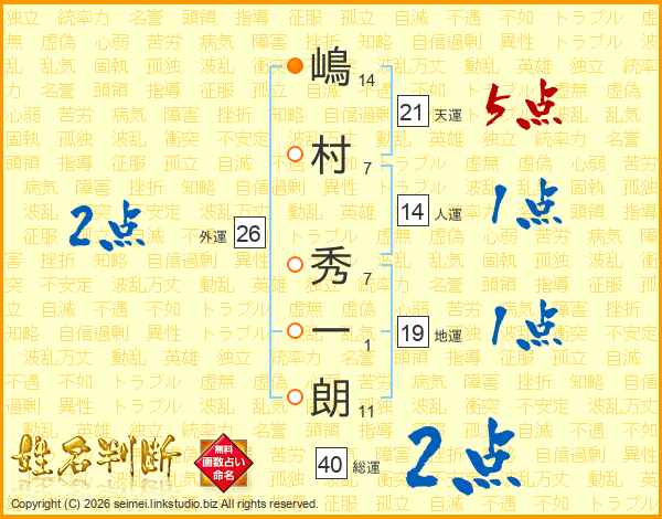 嶋(14画)村(7画) 秀(7画)一(1画)朗(11画)