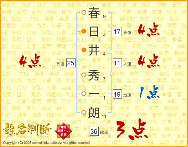 春(9画)日(4画)井(4画) 秀(7画)一(1画)朗(11画)