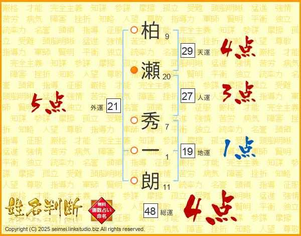 柏(9画)瀬(20画) 秀(7画)一(1画)朗(11画)