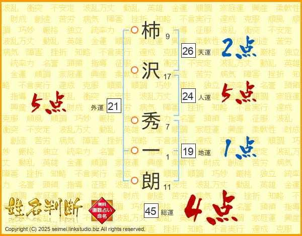 柿(9画)沢(17画) 秀(7画)一(1画)朗(11画)
