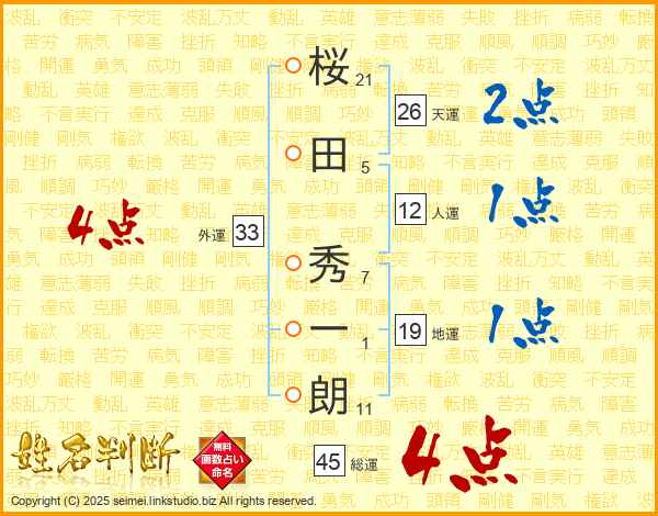 桜(21画)田(5画) 秀(7画)一(1画)朗(11画)