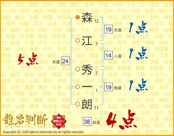 森(12画)江(7画) 秀(7画)一(1画)朗(11画)
