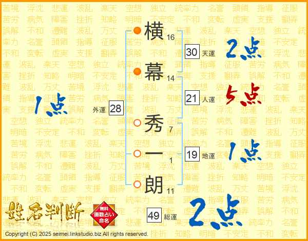 横(16画)幕(14画) 秀(7画)一(1画)朗(11画)