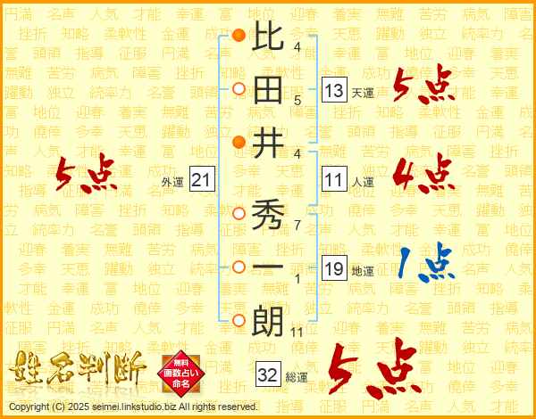 比(4画)田(5画)井(4画) 秀(7画)一(1画)朗(11画)