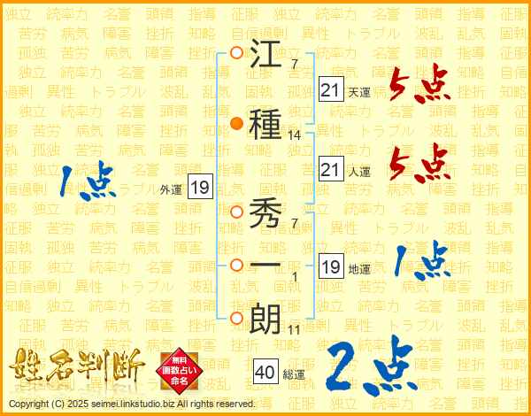 江(7画)種(14画) 秀(7画)一(1画)朗(11画)