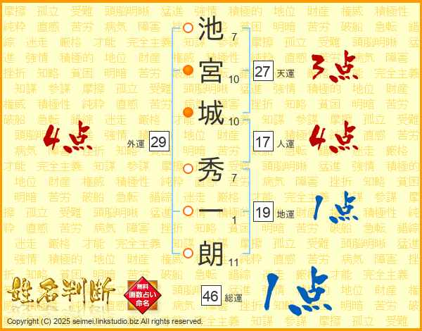 池(7画)宮(10画)城(10画) 秀(7画)一(1画)朗(11画)