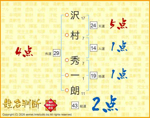 沢(17画)村(7画) 秀(7画)一(1画)朗(11画)