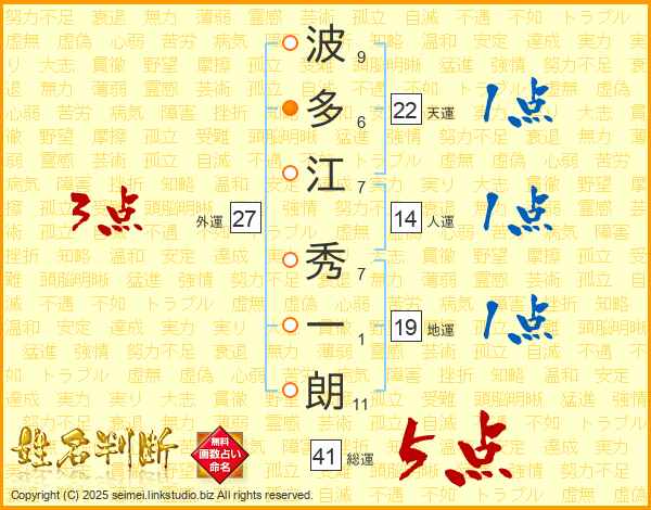 波(9画)多(6画)江(7画) 秀(7画)一(1画)朗(11画)