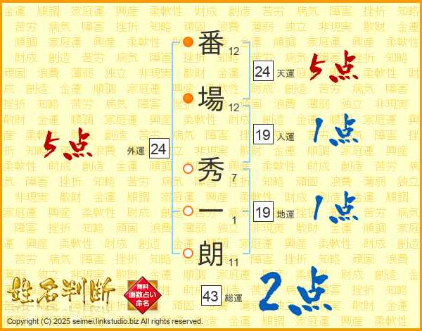 番(12画)場(12画) 秀(7画)一(1画)朗(11画)