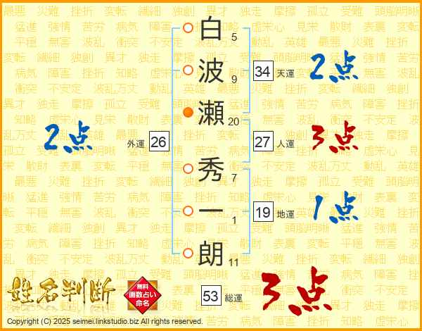 白(5画)波(9画)瀬(20画) 秀(7画)一(1画)朗(11画)