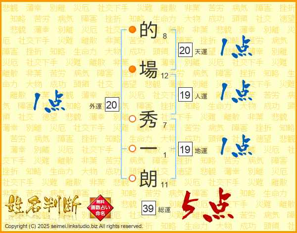 的(8画)場(12画) 秀(7画)一(1画)朗(11画)