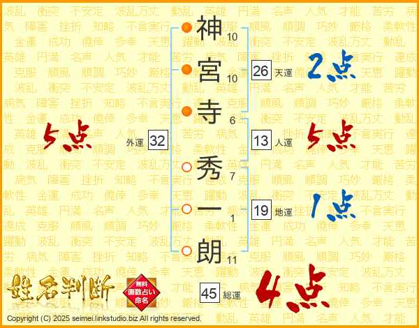 神(10画)宮(10画)寺(6画) 秀(7画)一(1画)朗(11画)