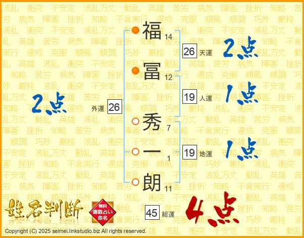福(14画)冨(12画) 秀(7画)一(1画)朗(11画)