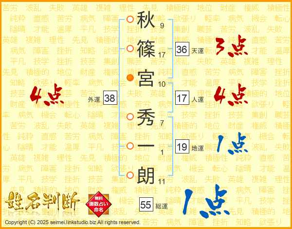 秋(9画)篠(17画)宮(10画) 秀(7画)一(1画)朗(11画)