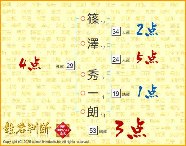 篠(17画)澤(17画) 秀(7画)一(1画)朗(11画)